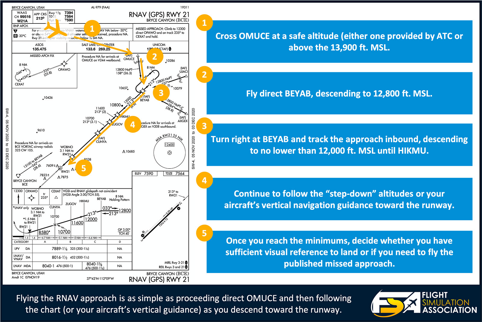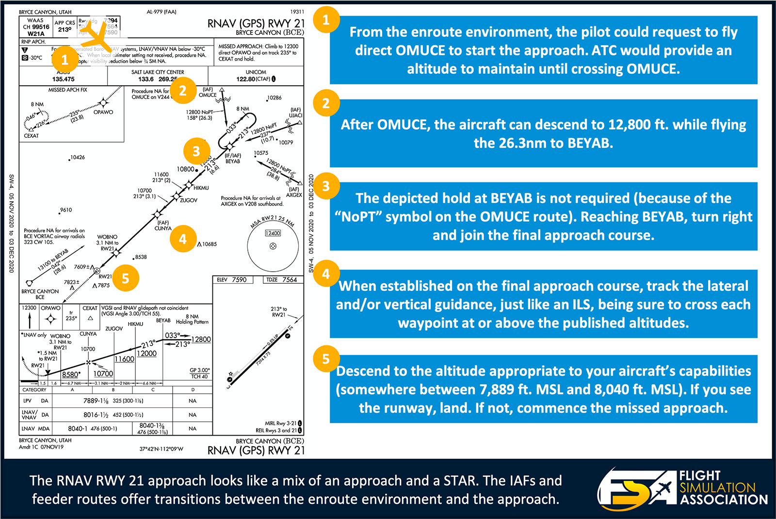 This briefing will assume the weather and wind favor landing on Runway 21 and will look at the RNAV RWY 21 approach. Like an ILS, the chart provides some critical information for flying the approach. You may notice that this chart looks like something of a hybrid between a STAR (like the BEARR# we flew into KSLC) and an ILS approach. In addition to the final approach course (made up of the waypoints BEYAB, HIKMU, ZUGOV, and CUYNA), there are transitions OMCUE, UJACI, AXGEX, and BCE. These transitions provide a safe way to navigate from the enroute environment onto the approach. You can think of them like miniature STARs: an aircraft can cross OMUCE, then descend to 12,800 ft. while flying the 26.3 miles to BEYAB. From there, you turn right to join the final approach course and fly the approach.