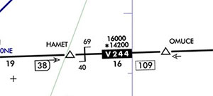 When looking at the enroute navigation chart, the 16,000 ft. altitude is the MEA on V244. The *14,200 represents the MOCA, or Minimum Obstacle Clearance Altitude. Unlike an MEA, the MOCA only assures acceptable navigational signal coverage within 22 NM of a VOR. This altitude will be authorized by ATC in the event of an emergency (e.g., engine failure, severe icing, etc.) where maintaining the MEA isn't possible.