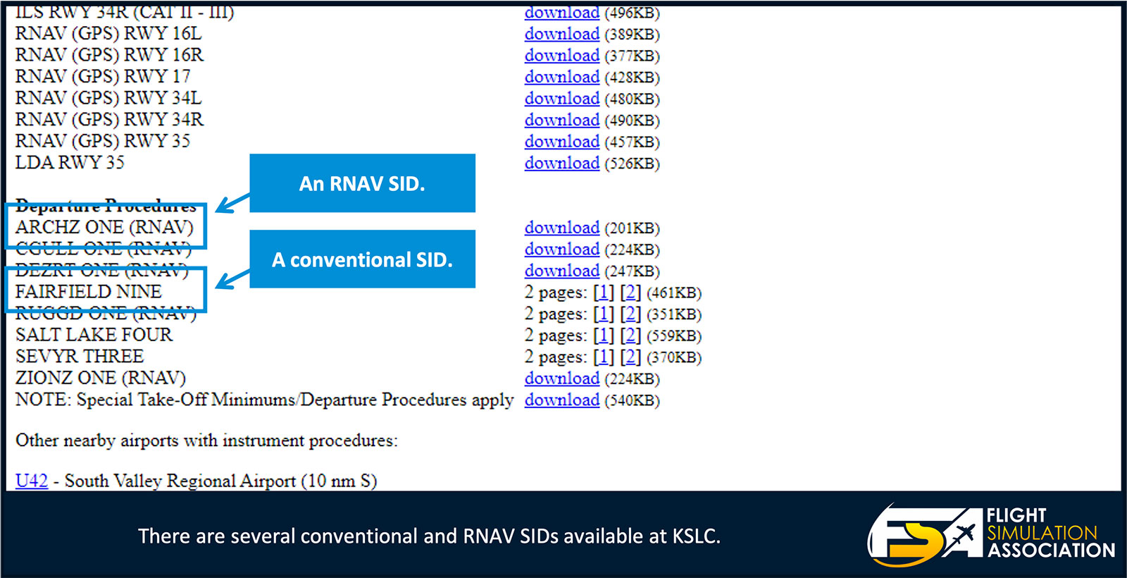 You'll notice a mix of conventional departures like the "Salt Lake #" and RNAV departures like the ARCHZ#. The RNAV departures are denoted by the "(RNAV)" symbol. First, open the ARCHZ# departure: