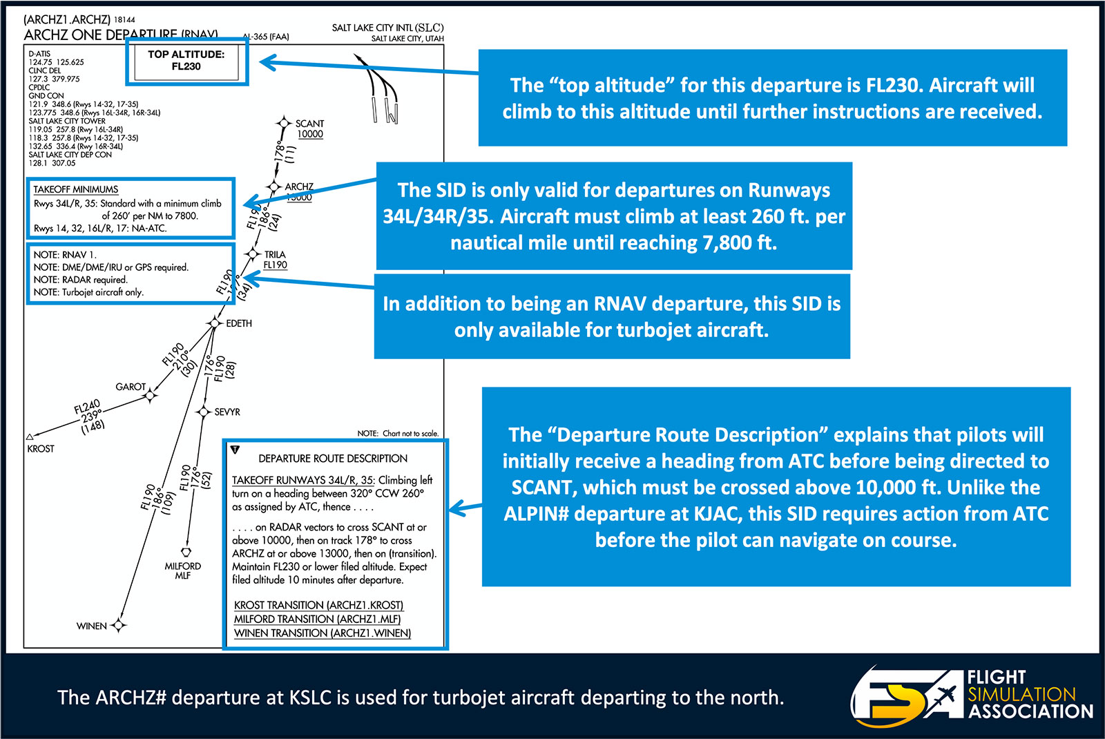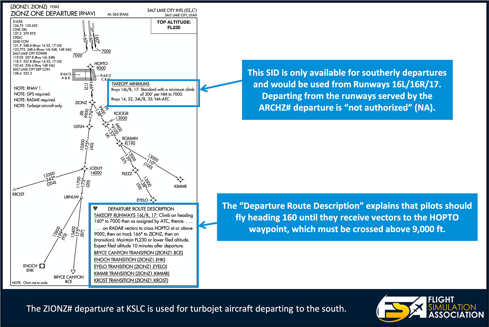 Just like when we were arriving at KSLC in the previous flight, use the planned departure runway to determine which SID to use. If you plan to depart from Runway 16R, you would use the ZIONZ# departure. For this flight, we'll assume the wind favors a northbound departure (from Runway 34L, in this example) and so we'll use the ARCHZ# departure.
