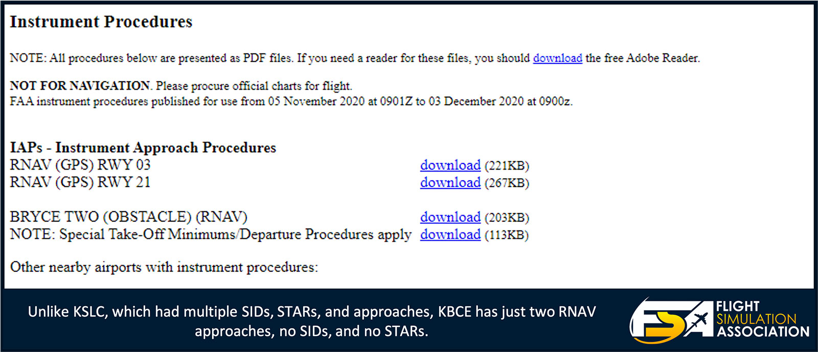 Unlike at KSLC, there are no STARs to help us with the arrival into KBCE. Also, being a small regional airport, KBCE doesn't have a control tower. That means it's up to us to decide on a safe way to fly to, and approach, the airport.