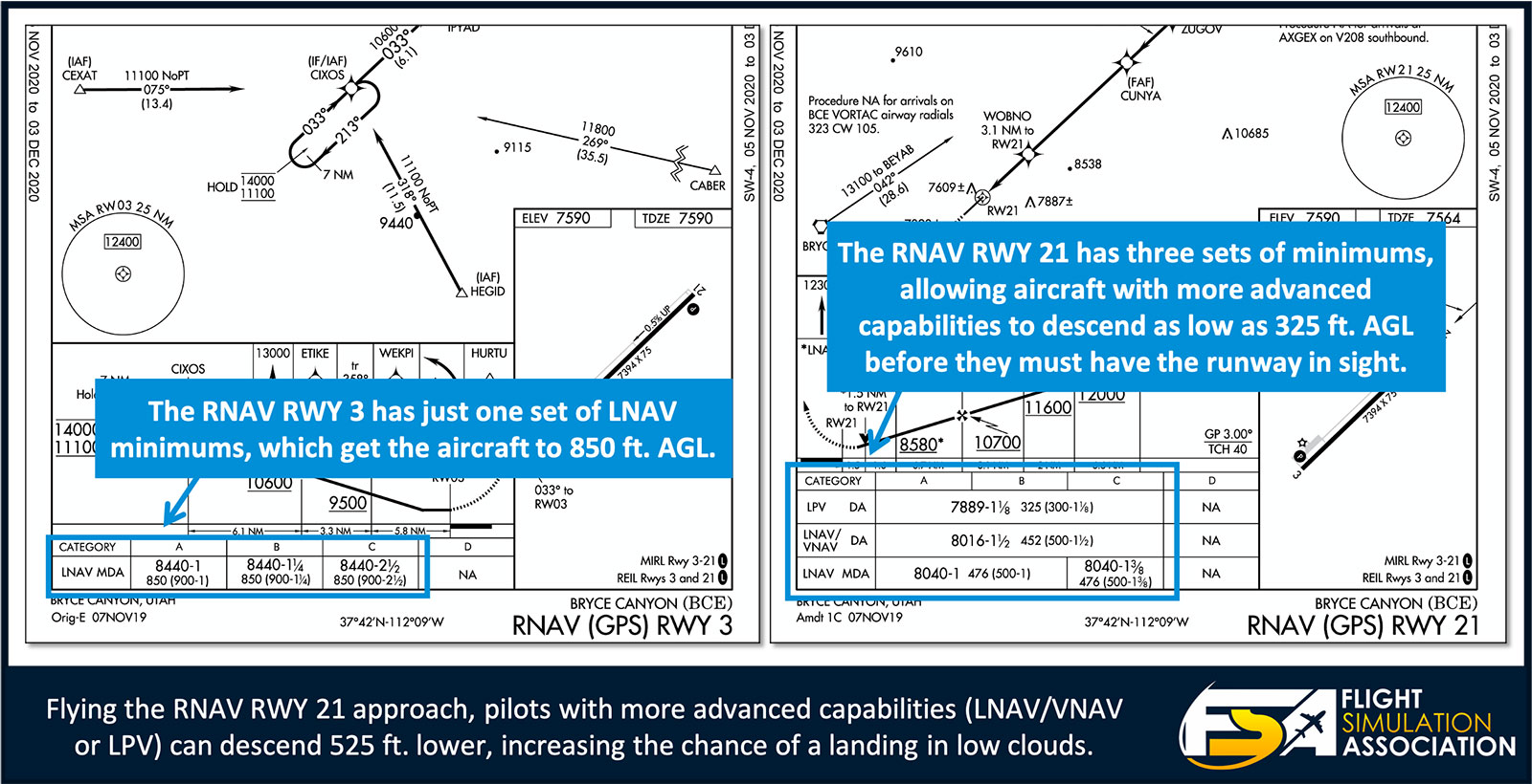 As you can see, in low-weather conditions, it might be favorable to fly the RNAV RWY 21 approach with a slight tailwind, since you can fly as low as 325 ft. AGL (with LPV equipment) before you must have acquired the runway visually. The RNAV RWY 3 approach only gets you as low as 850 ft. AGL. If the clouds were located at 500 ft. AGL, only the RNAV RWY 21 approach would work; a pilot flying the RNAV RWY 3 would likely end up flying the missed approach. That said, accepting a tailwind on a short runway in bad weather and at an almost 8,000 ft.-high airport might not be the best idea!